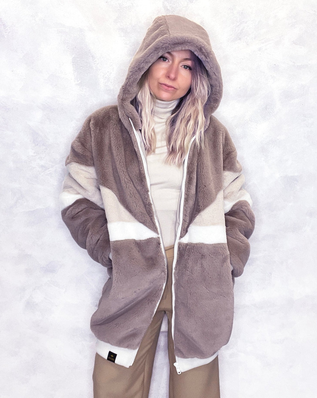 Taupe & Cream Faux Fur Hooded Long Bomber Jacket