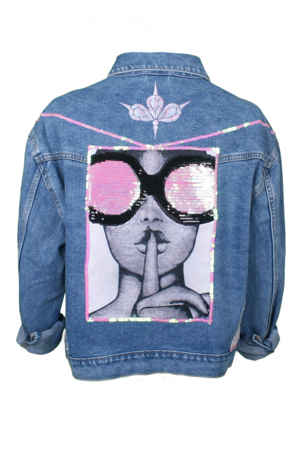 Mid-wash denim jacket lady sunglasses print with pink sequin panels