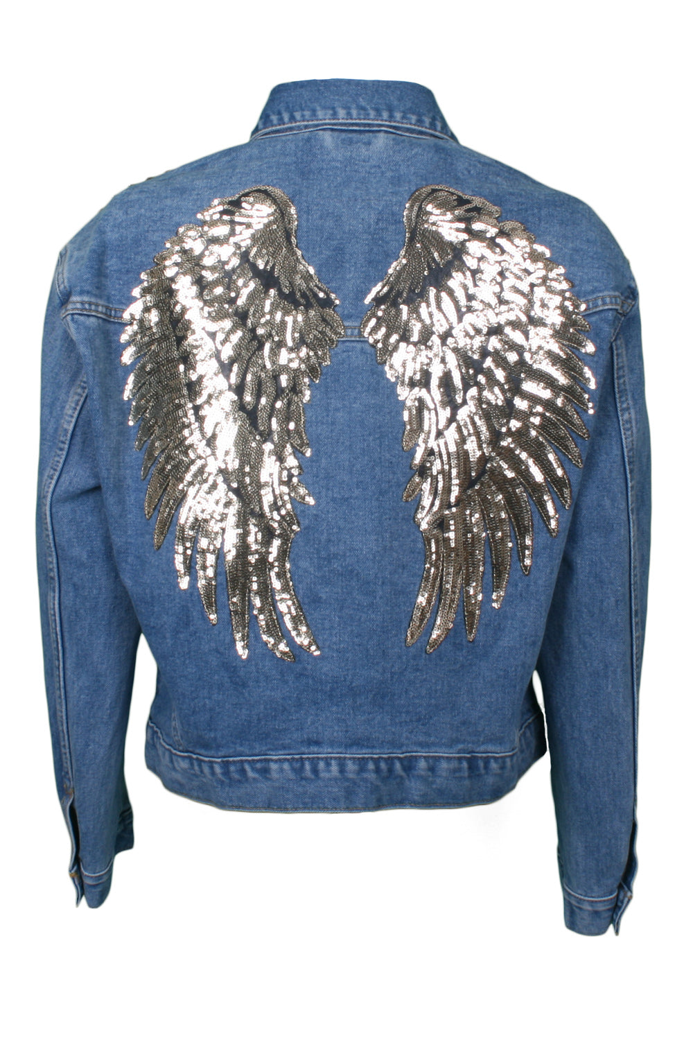 Mid-wash denim jacket gold wings with sequin and stud trims
