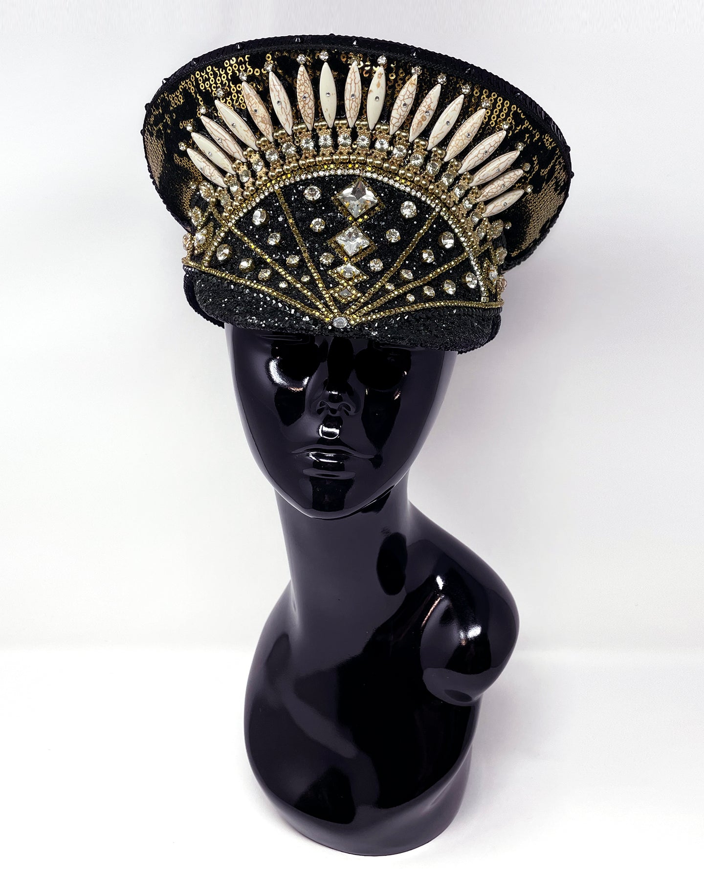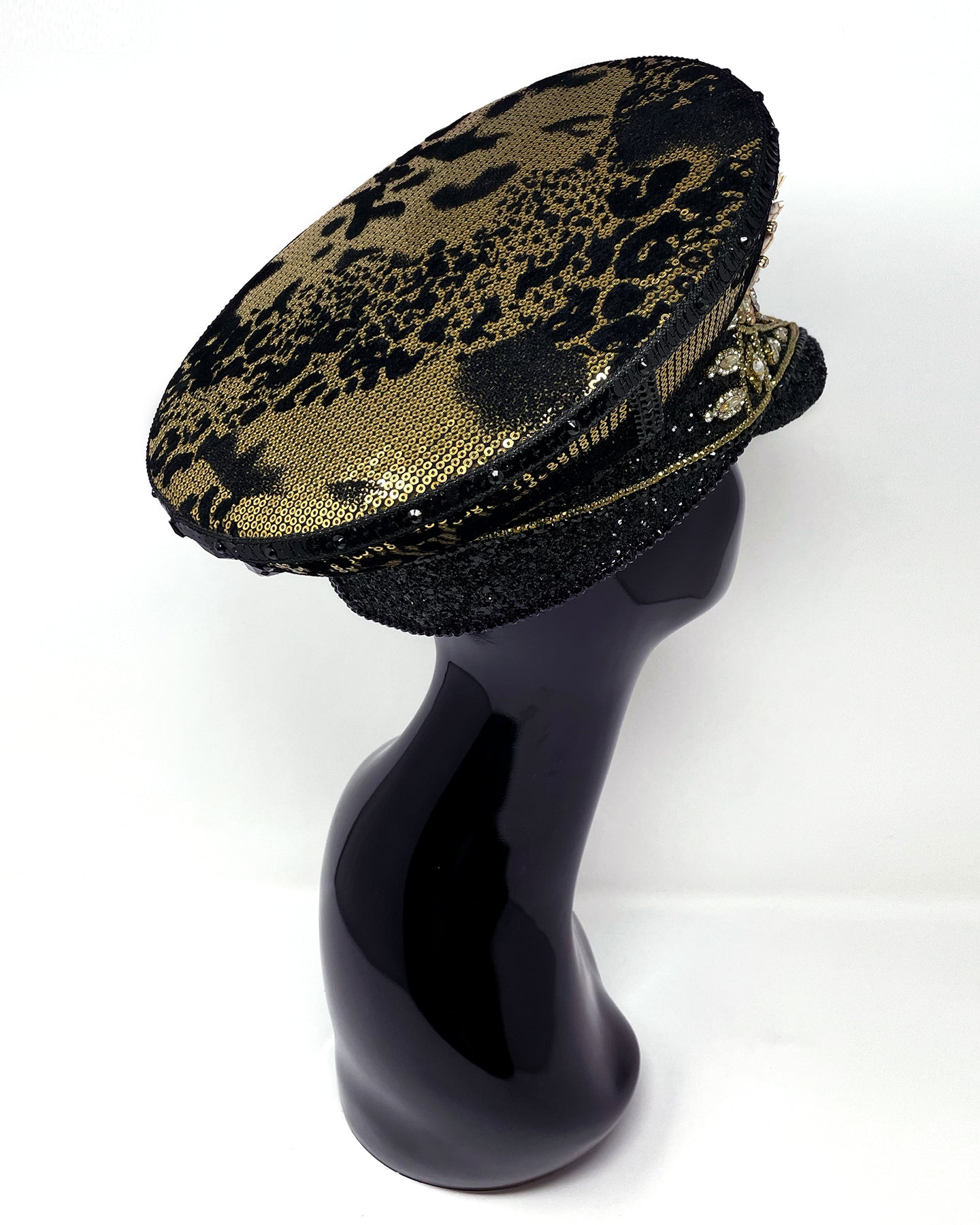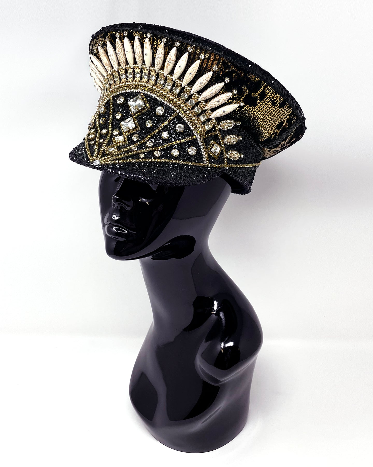 All Jukebox Fashion hats are hand crafted in the UK, with each and every piece of fabric, trim, gemstone and sequin carefully embellished and fixed in place. The base is always made from a genuine military hat (no Chinese copies to be found here) which means our products are tough enough to survive most weather conditions and the craziest of parties.