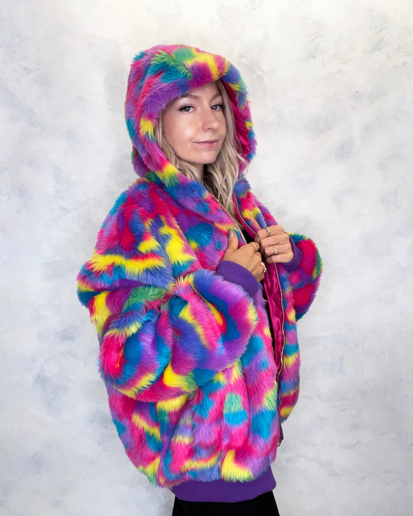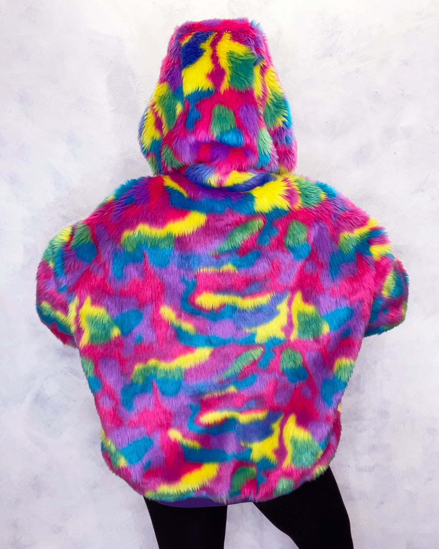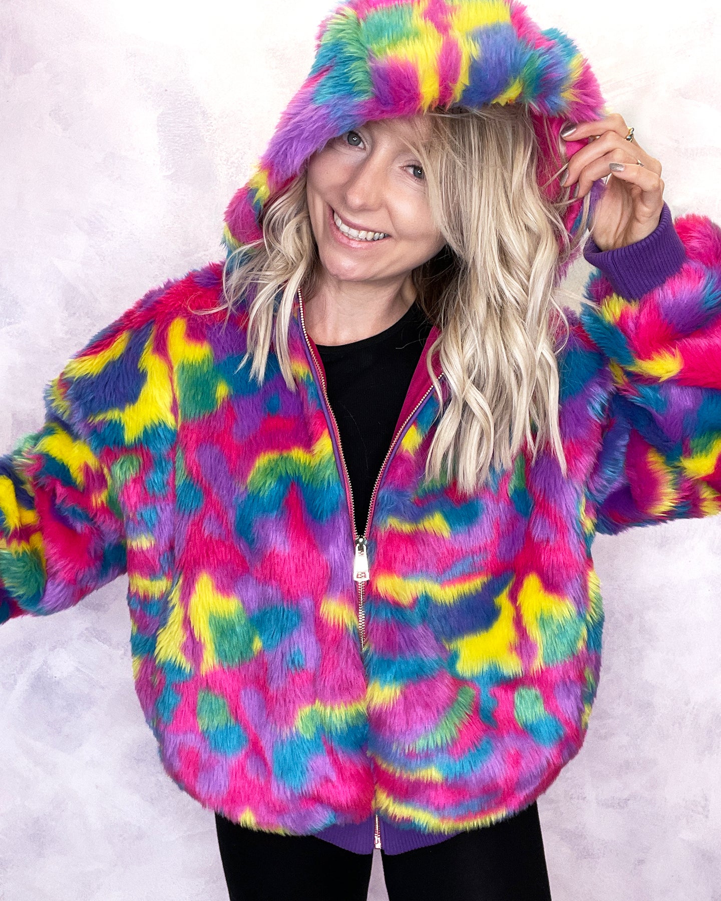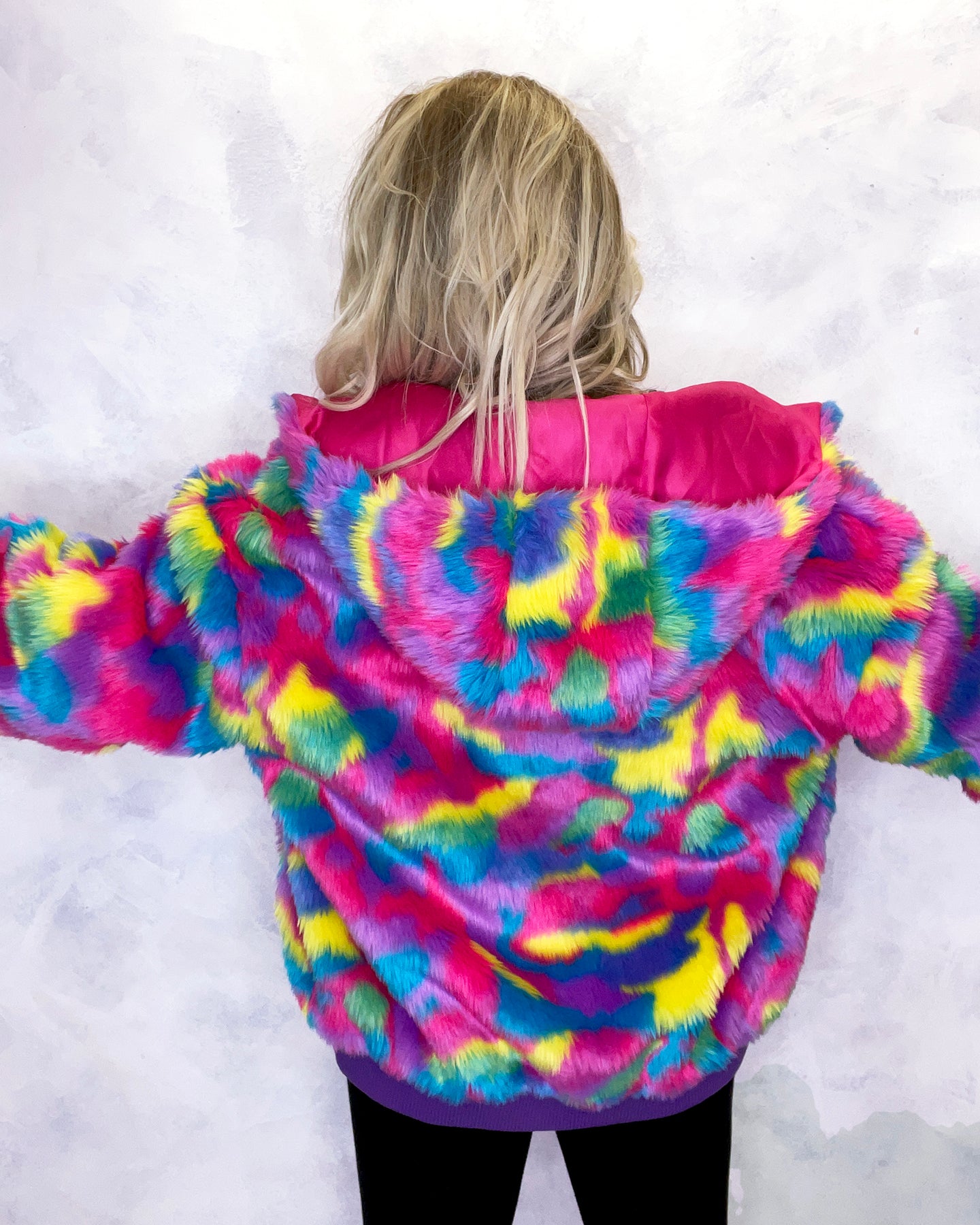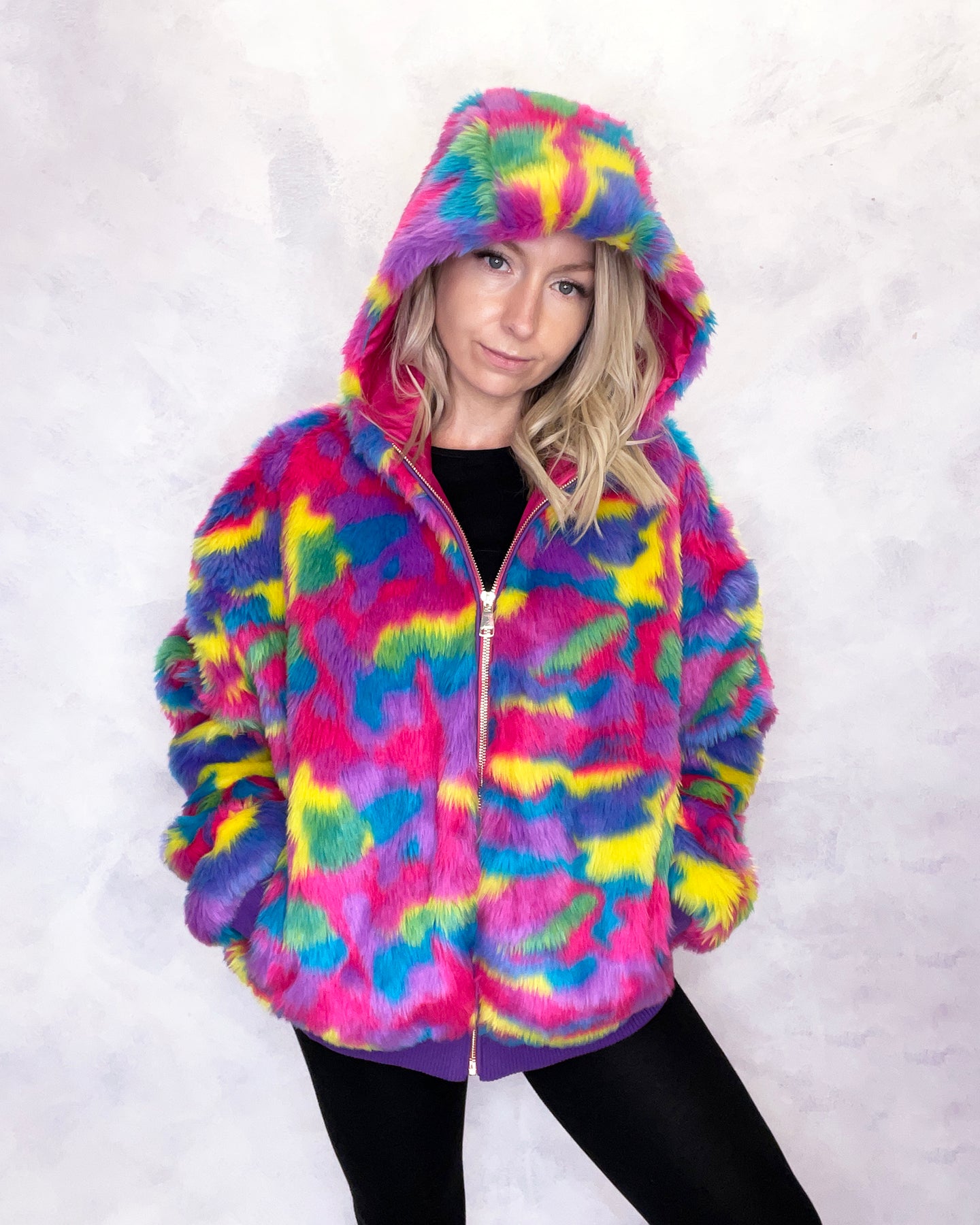 A multi-coloured soft luxury faux fur hooded bomber jacket designed to wake up your wardrobe.