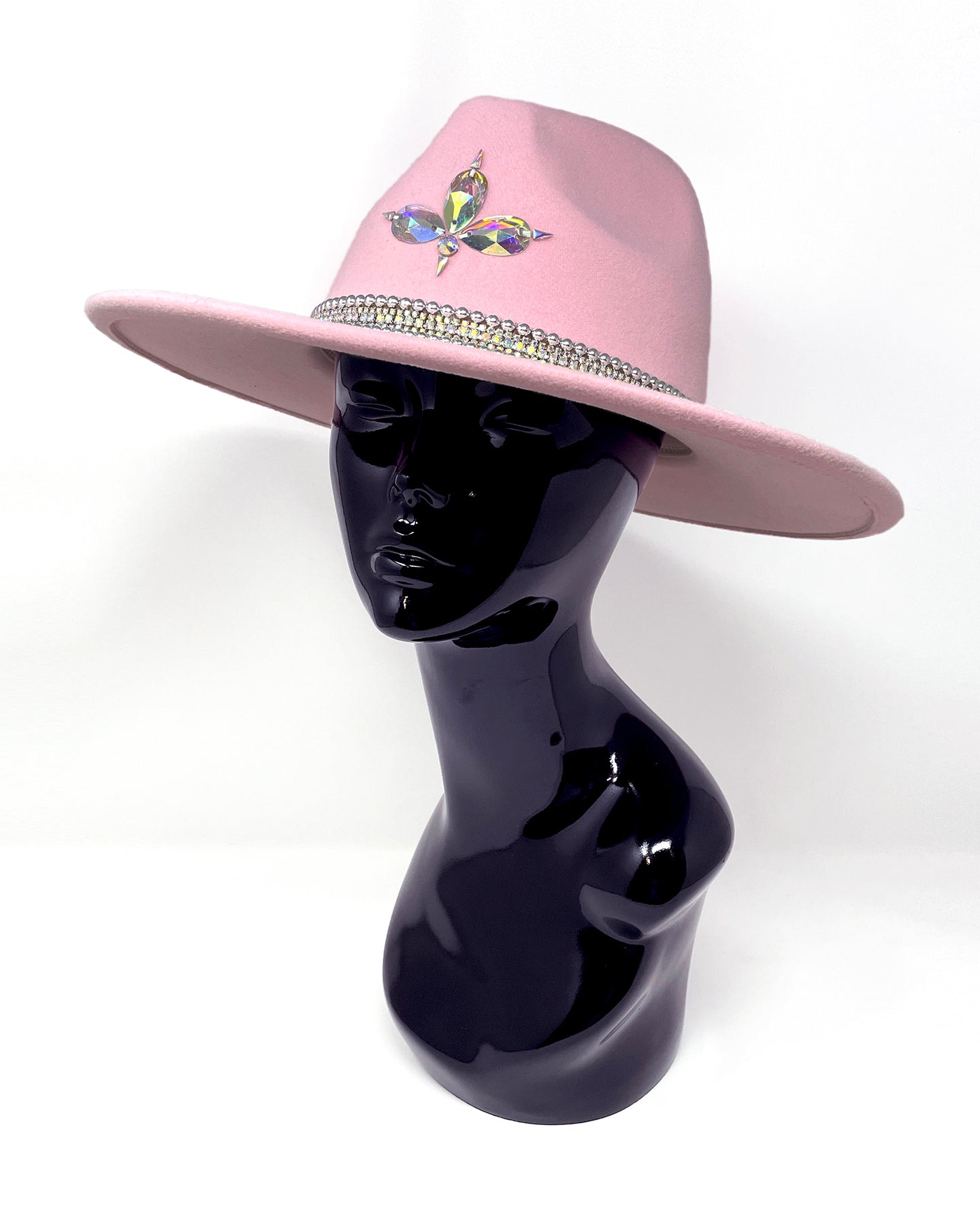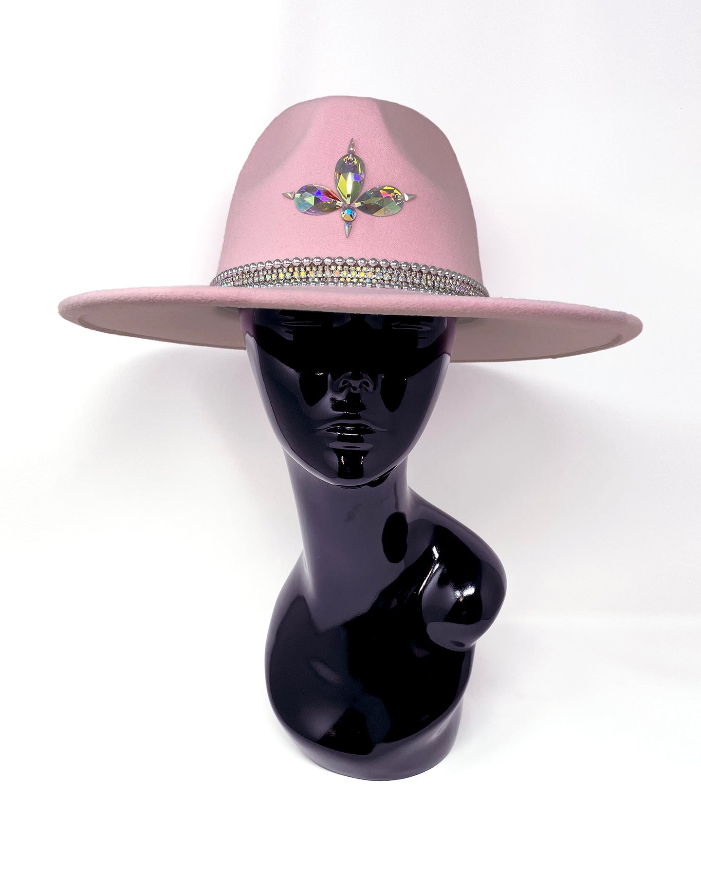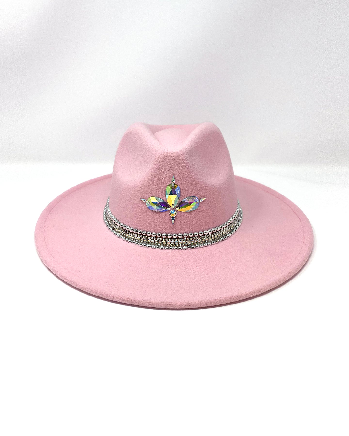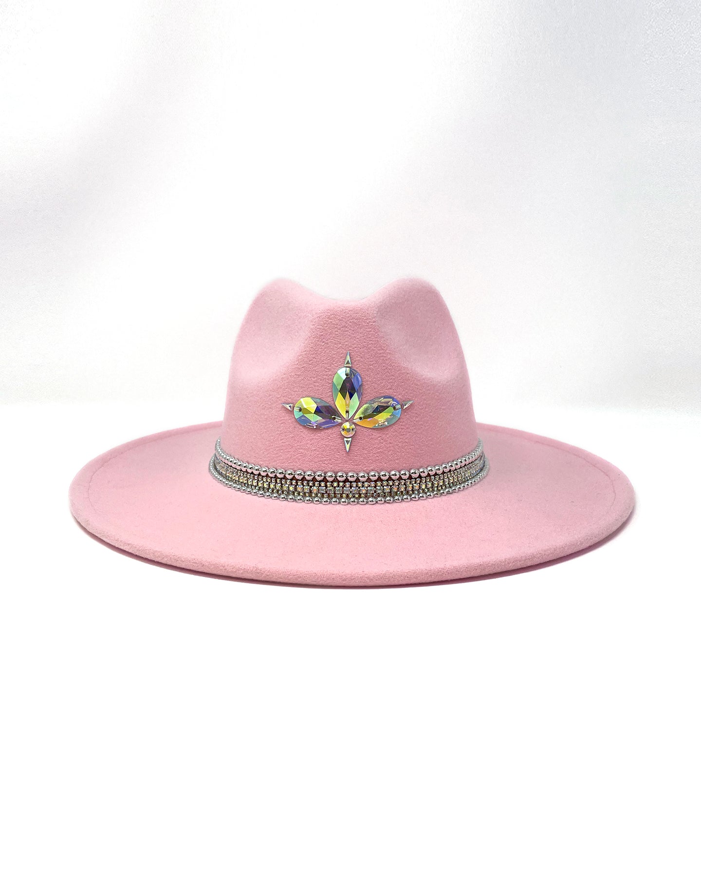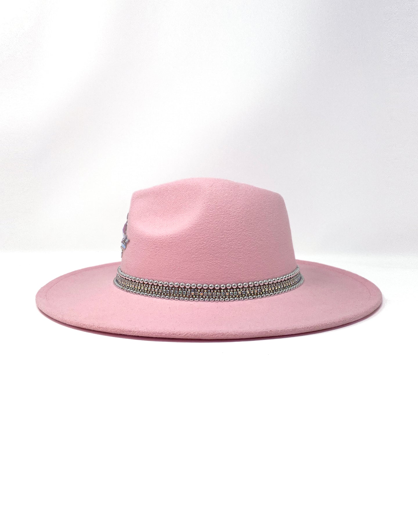 Light pink wide brim fedora hat, hand embellished with metal clasped crystals, silver pearl like rhinestones & Jukebox signature iridescent crystal logo. baby pink, ladies day, festival hat, boho, crystals, felt hat, hen do, bride hat, festival wear
