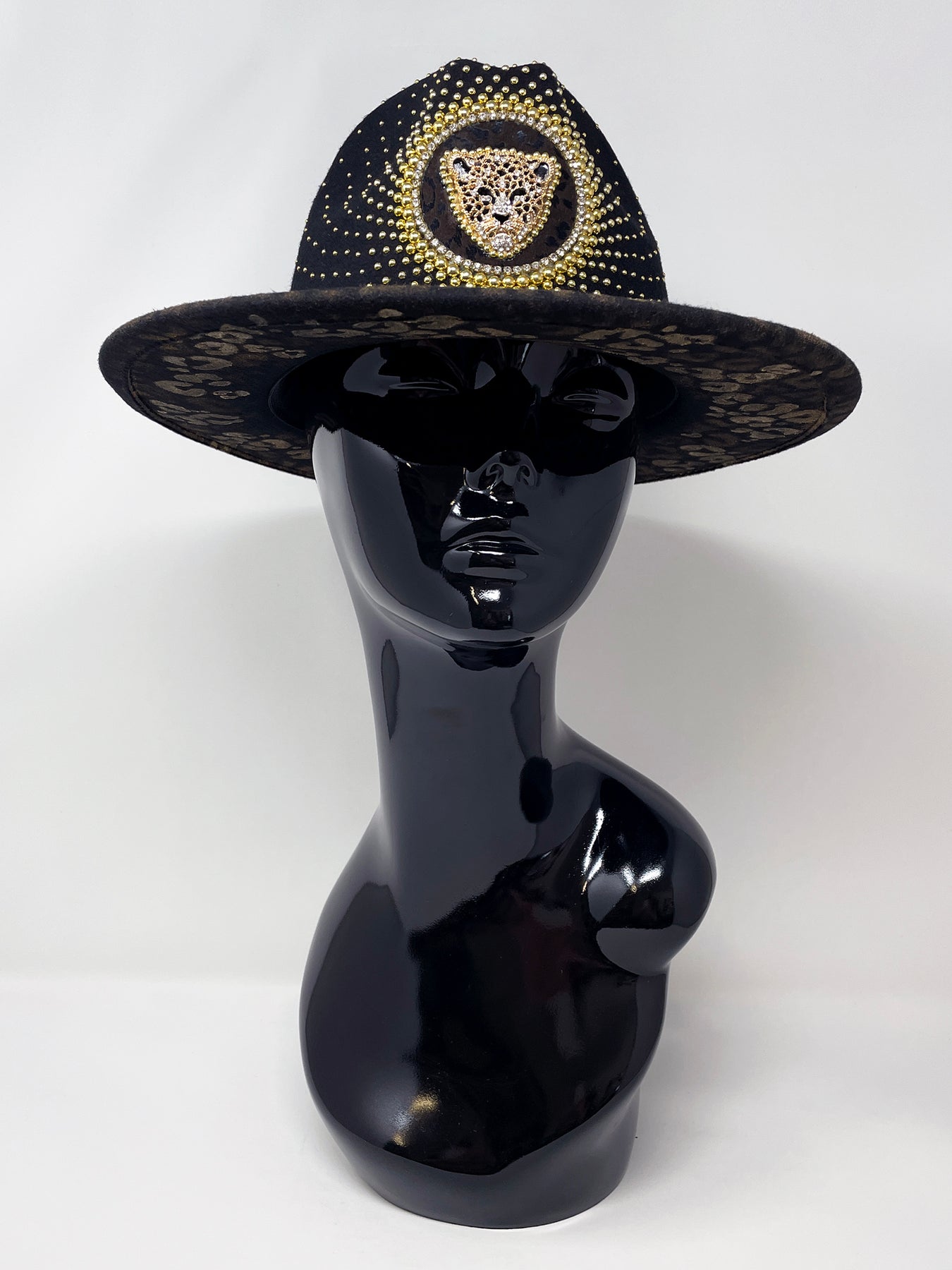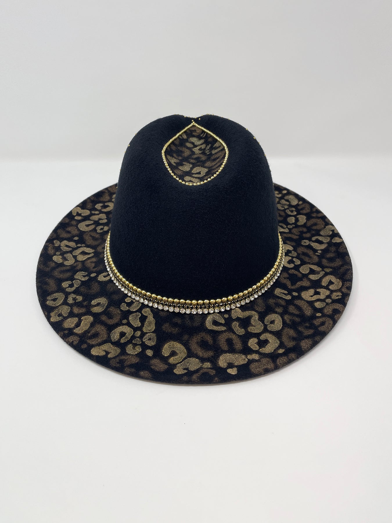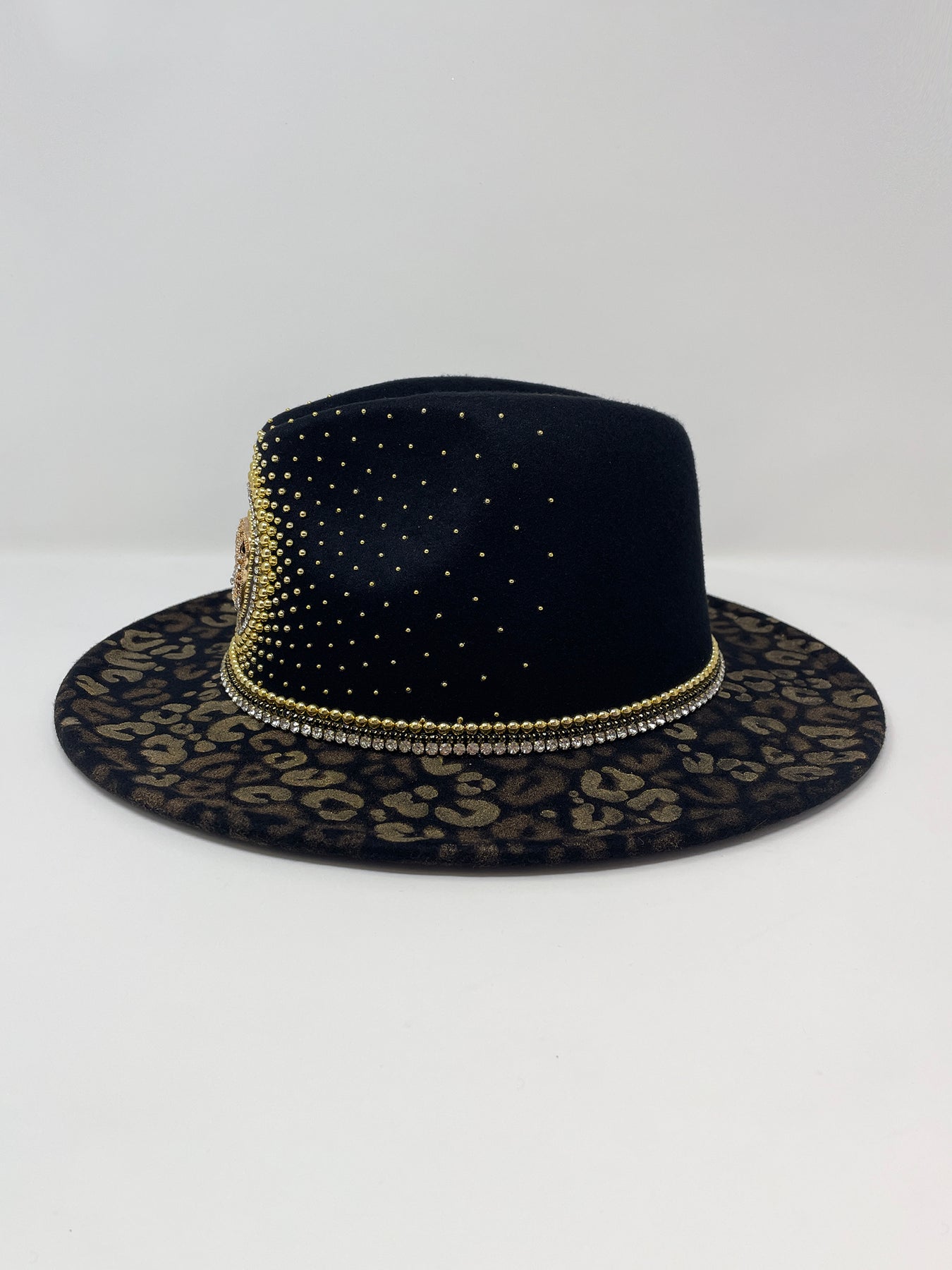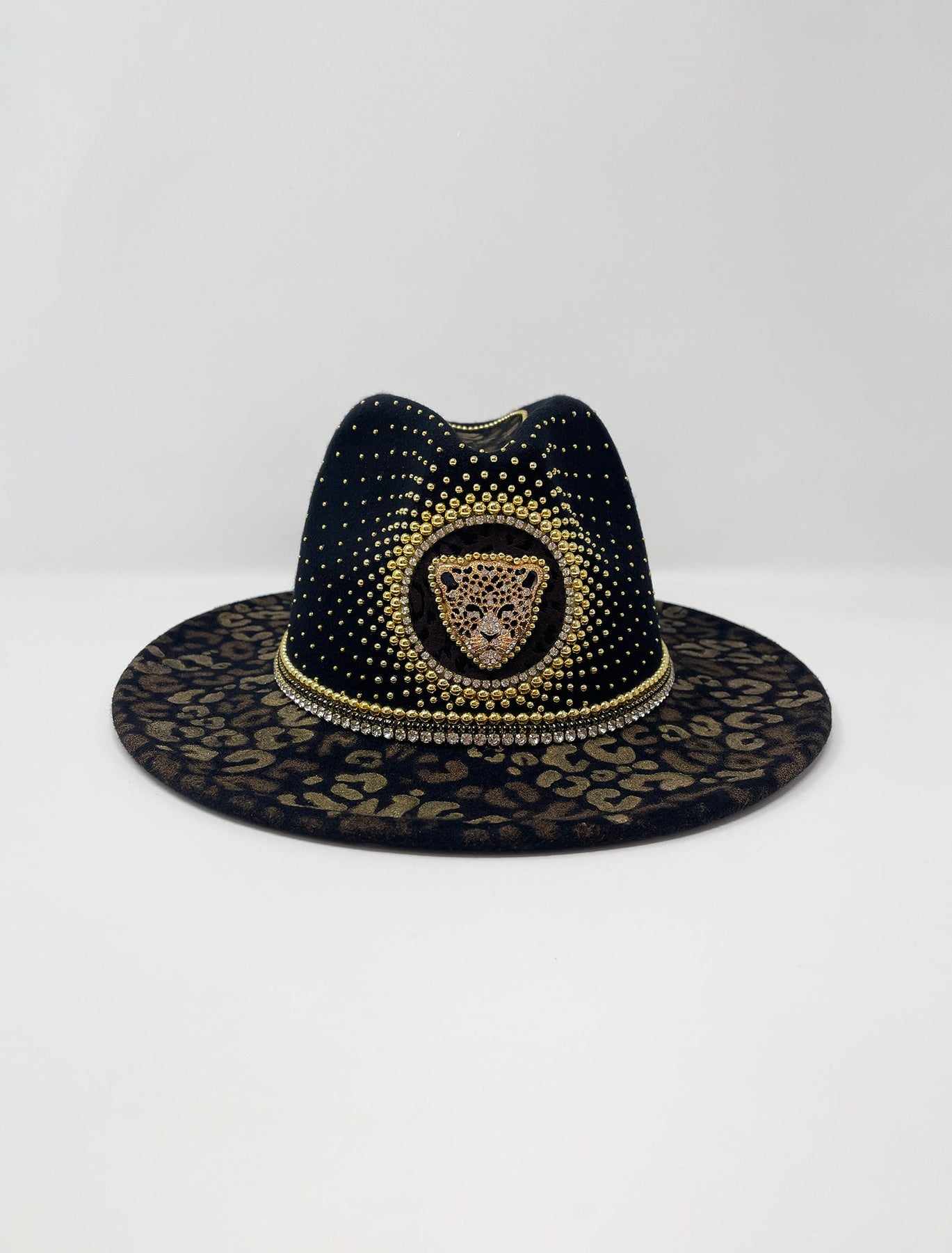 Short Brim black fedora hat, hand painted leopard print in metallic gold tones, with a gold metal and crystal leopard centre motif, embellished with gold pearl like rhinestones and crystals. gold splash, luxury fedora, made in the uk, handmade, statement hat, high end fashion, festival fedora, ibiza hat