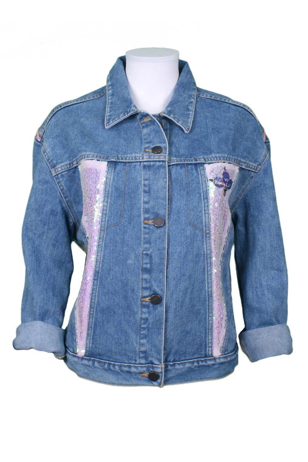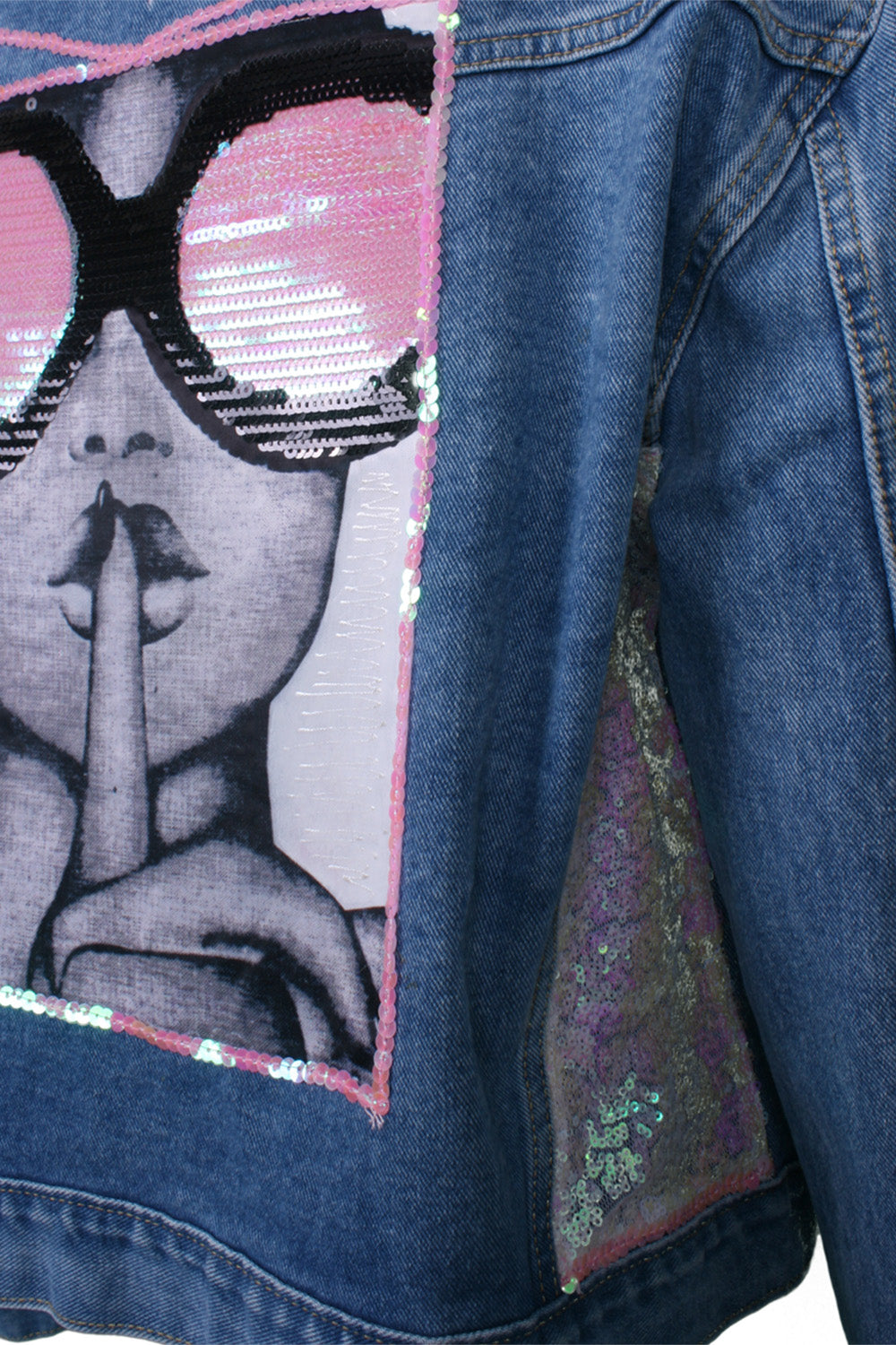 Mid-wash denim jacket lady sunglasses print with pink sequin panels