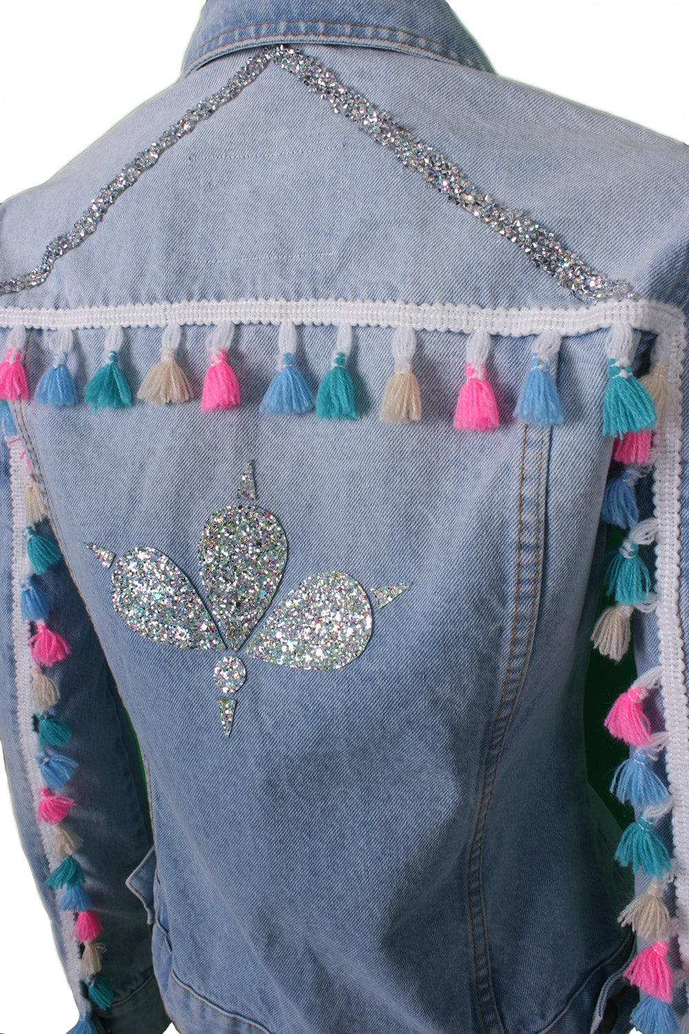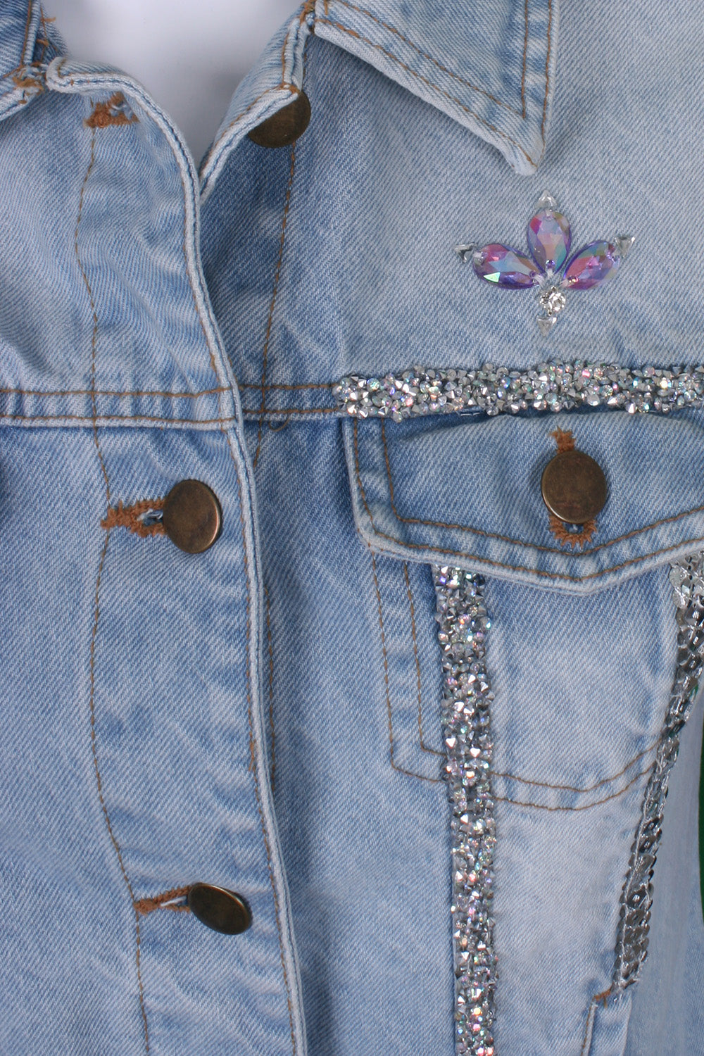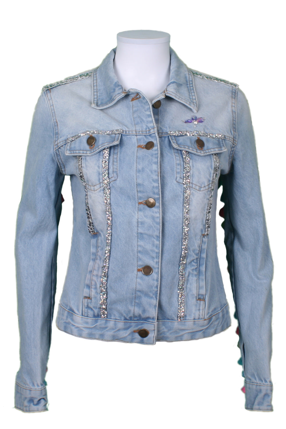 Light-wash denim jacket with tassel sleeves and crystal trims