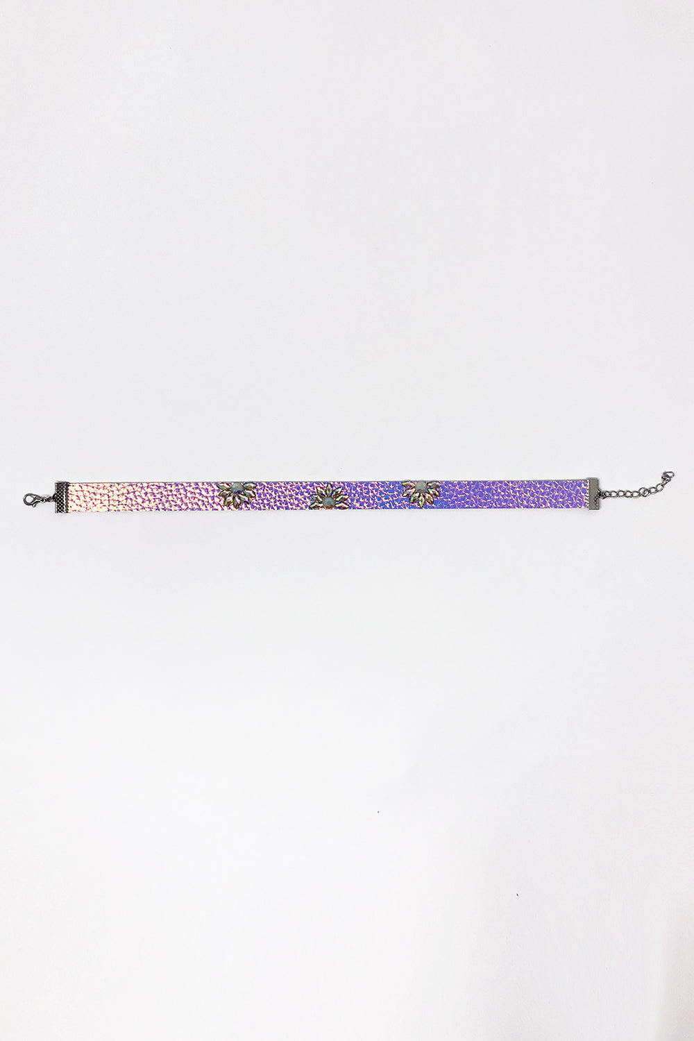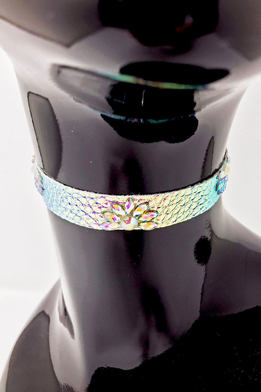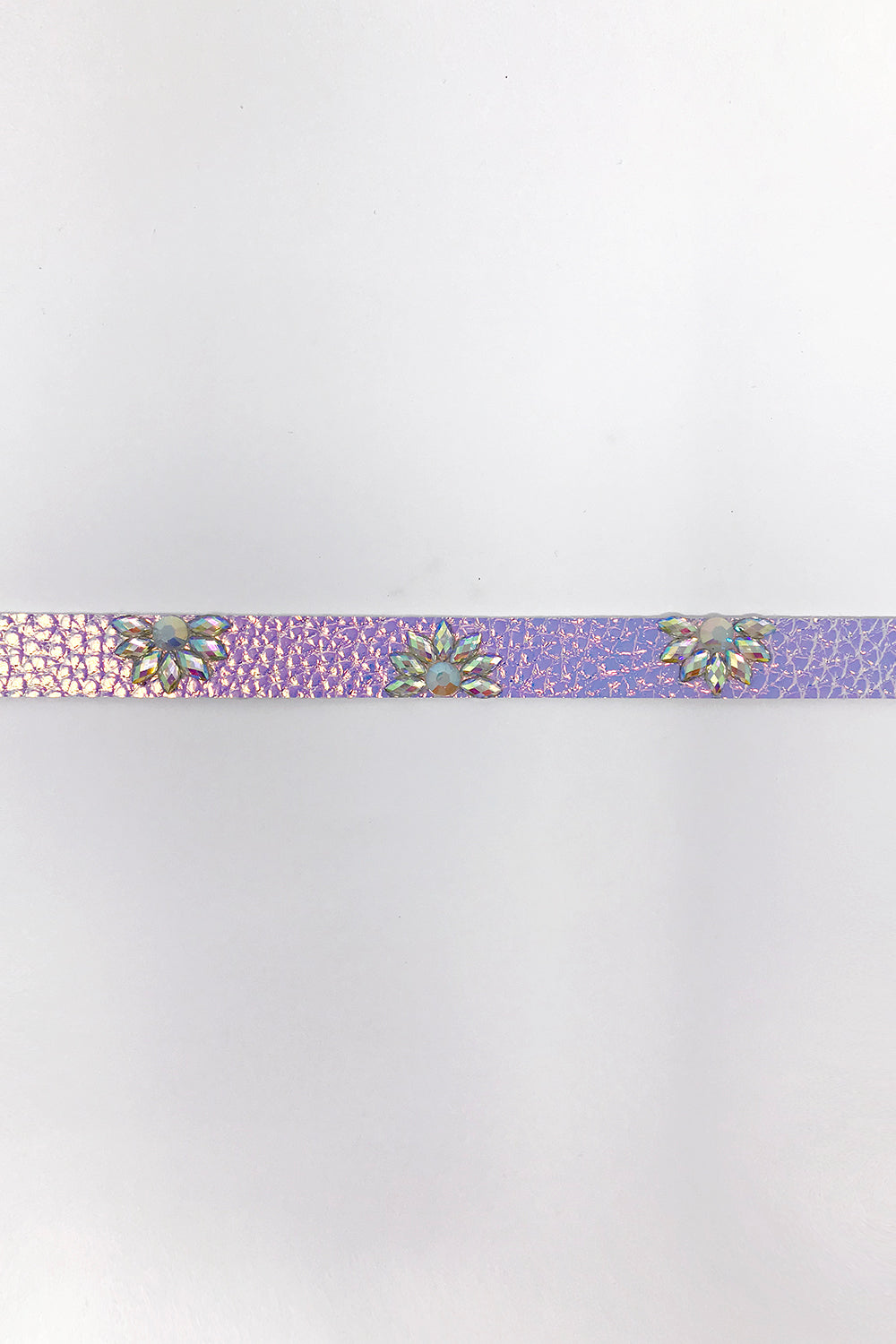Shimmer effect leatherette with flower shape clear iridescent rhinestones.