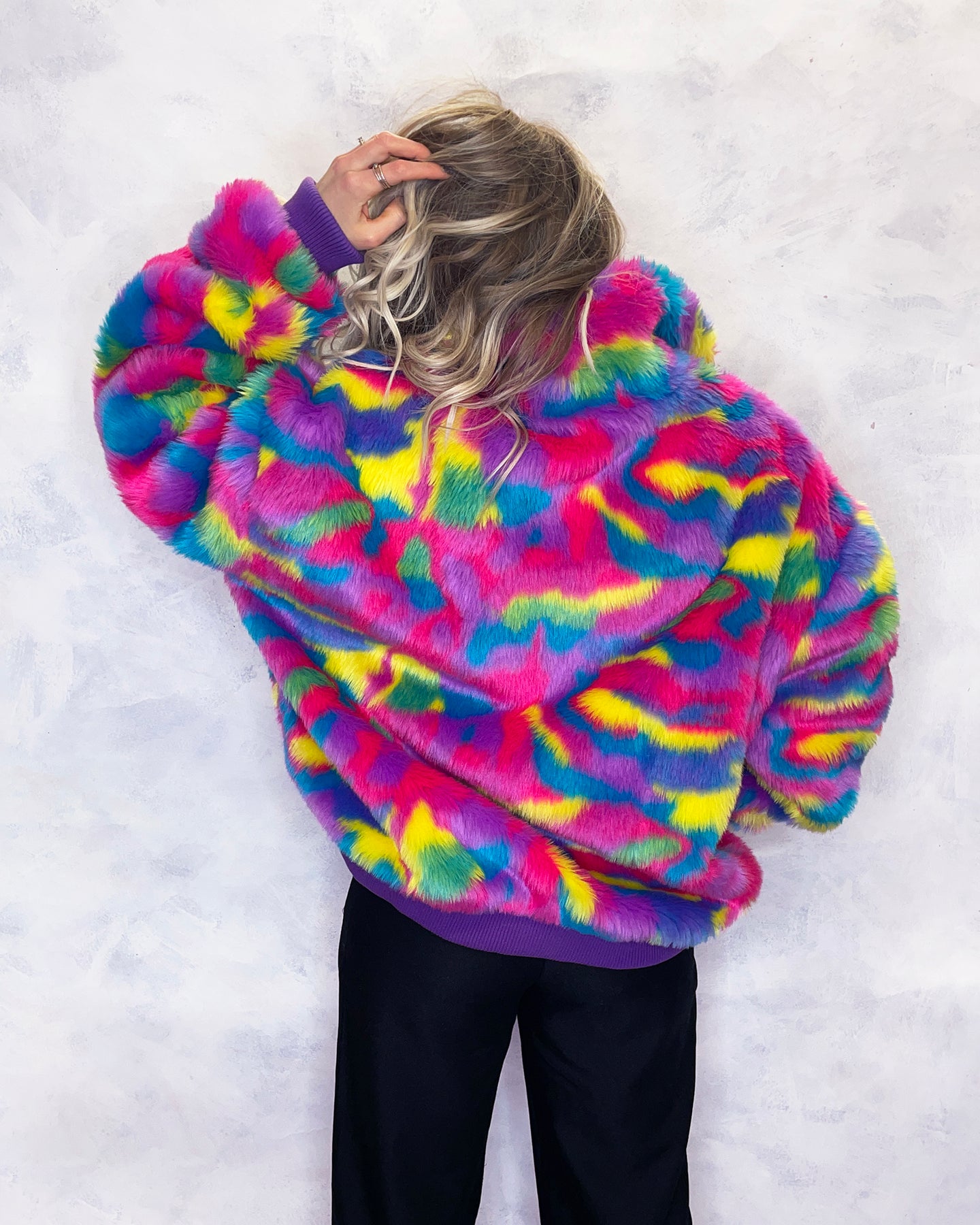 Turn heads and stay cosy in this vibrant faux fur bomber jacket, a bold statement piece handmade in the UK. Crafted from luxuriously faux fur, this jacket bursts with a kaleidoscope of colours including pink, purple, blue, yellow, and green, creating a fun and eye-catching look that radiates personality.