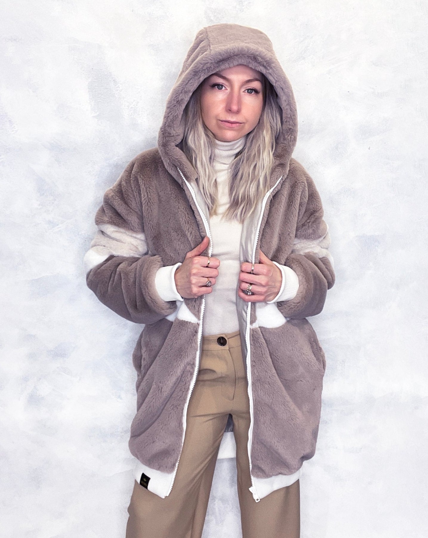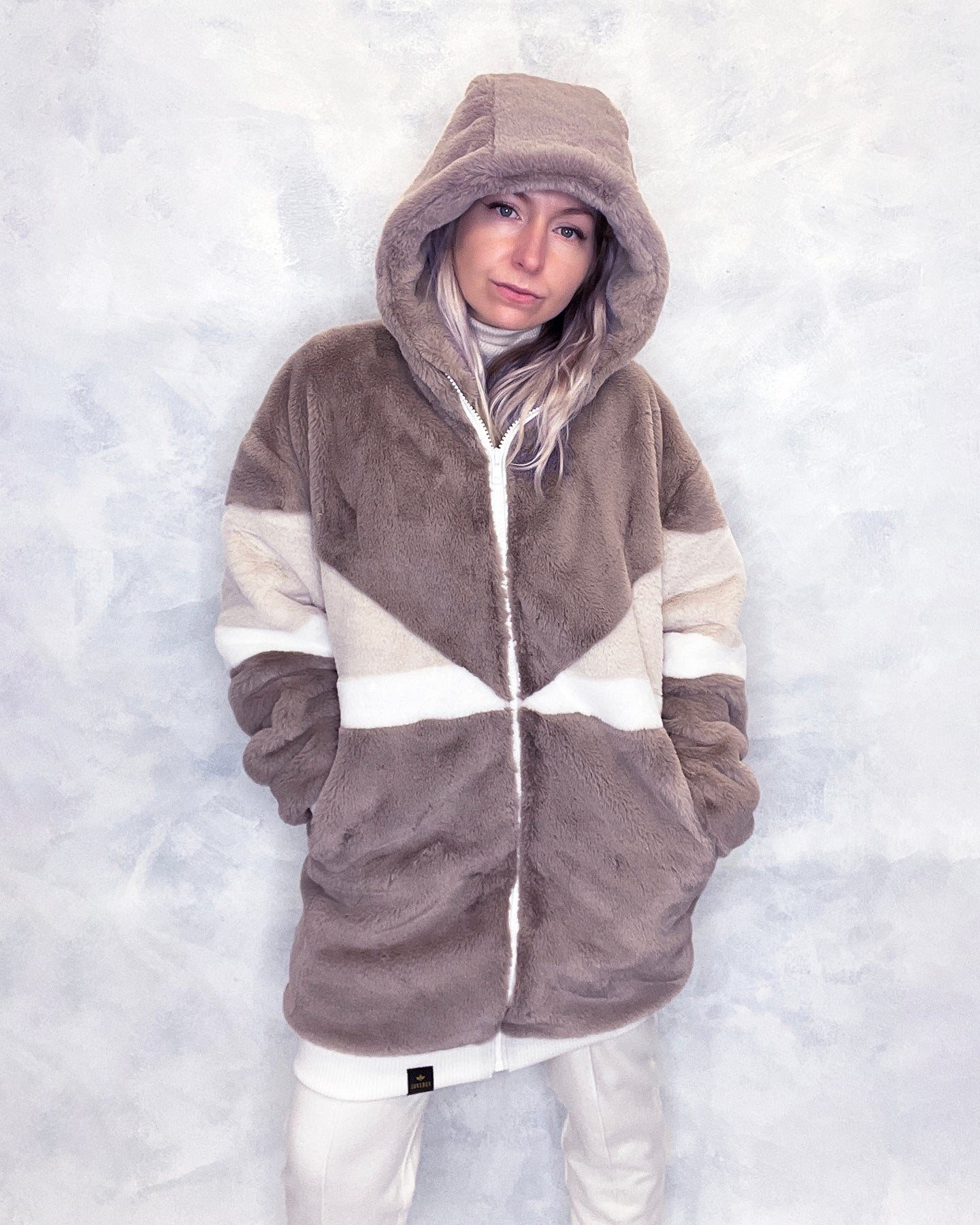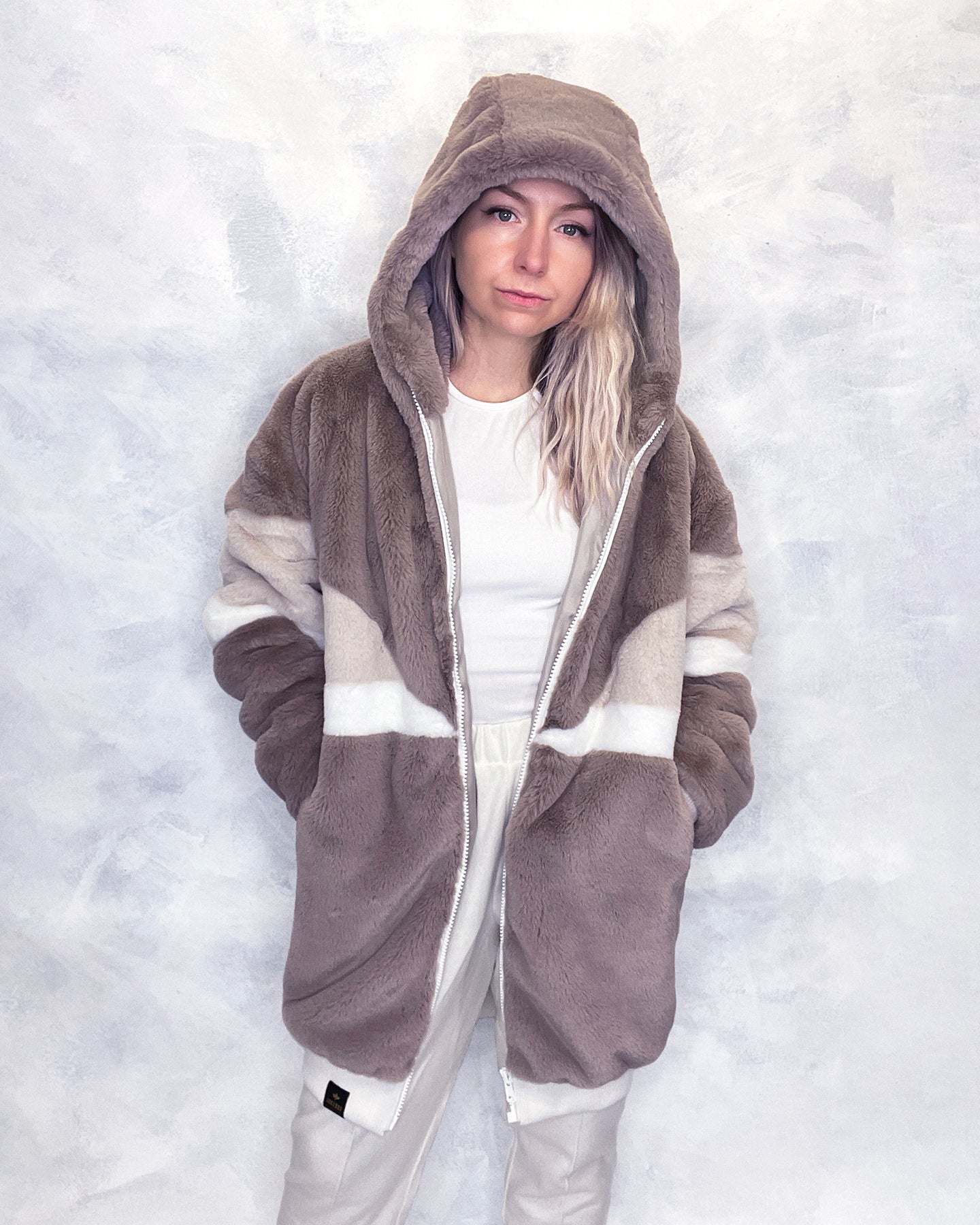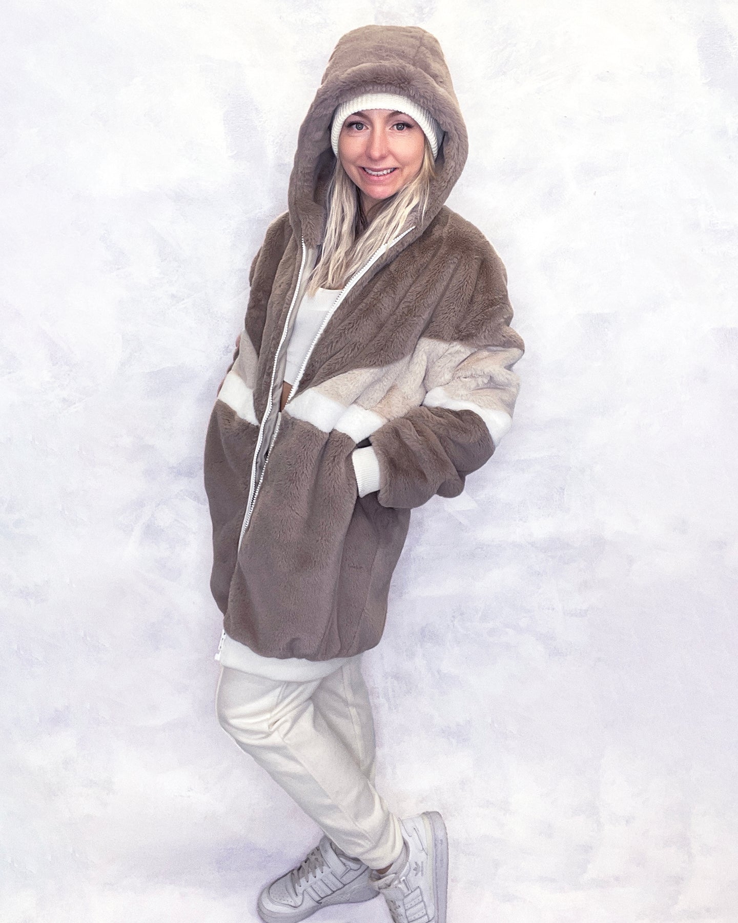 Taupe & Cream Faux Fur Hooded Long Bomber Jacket