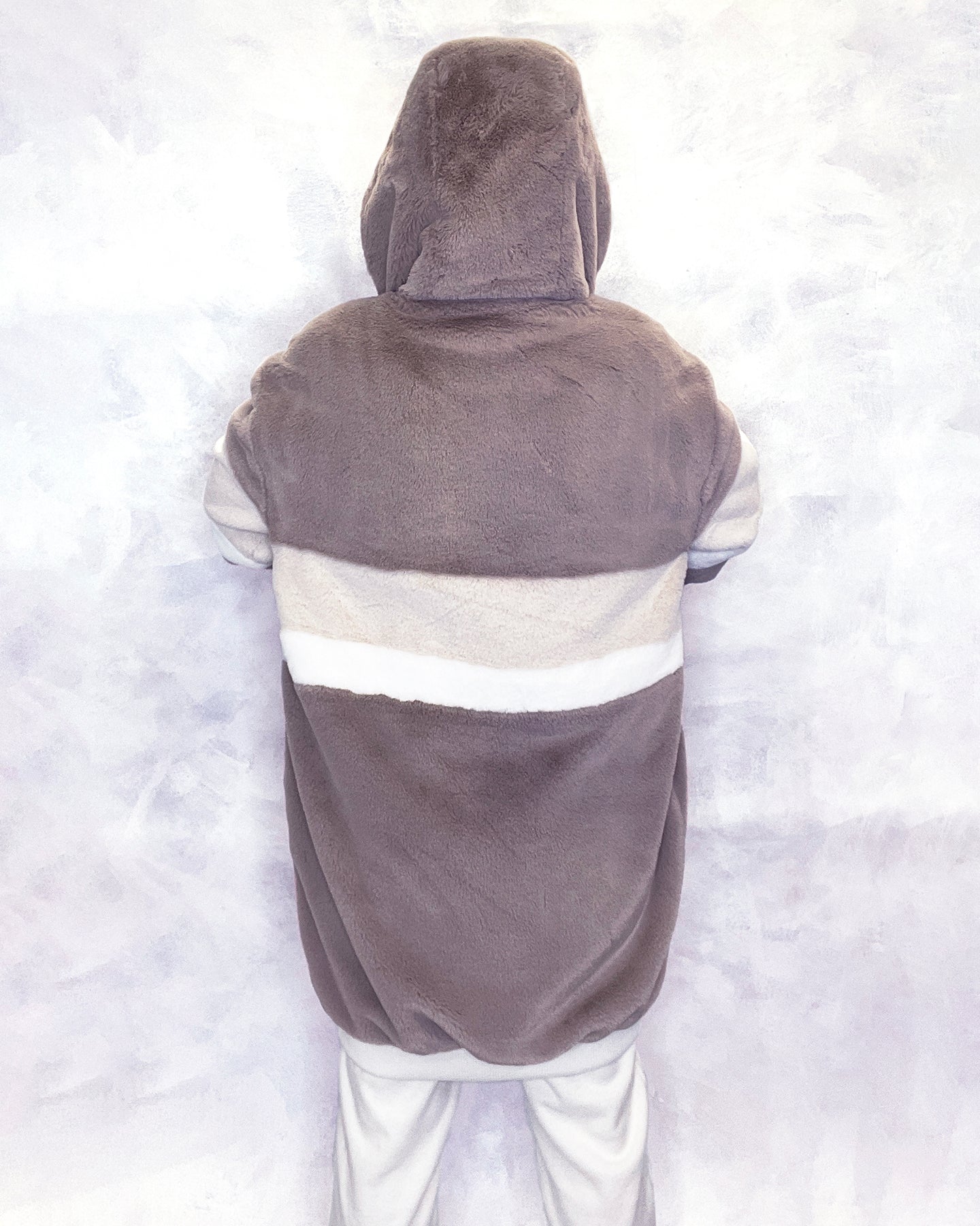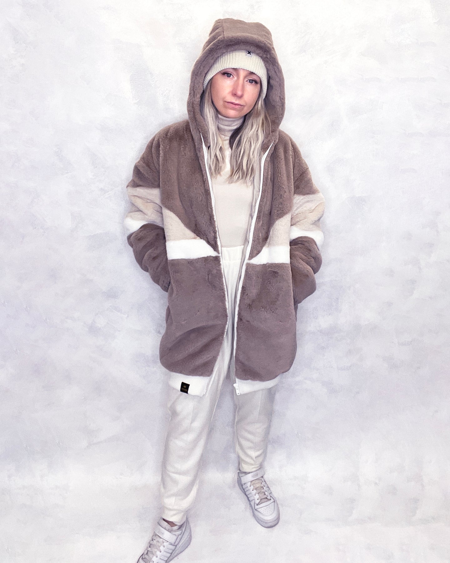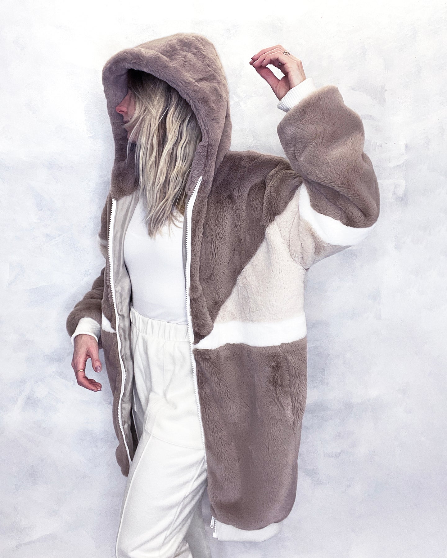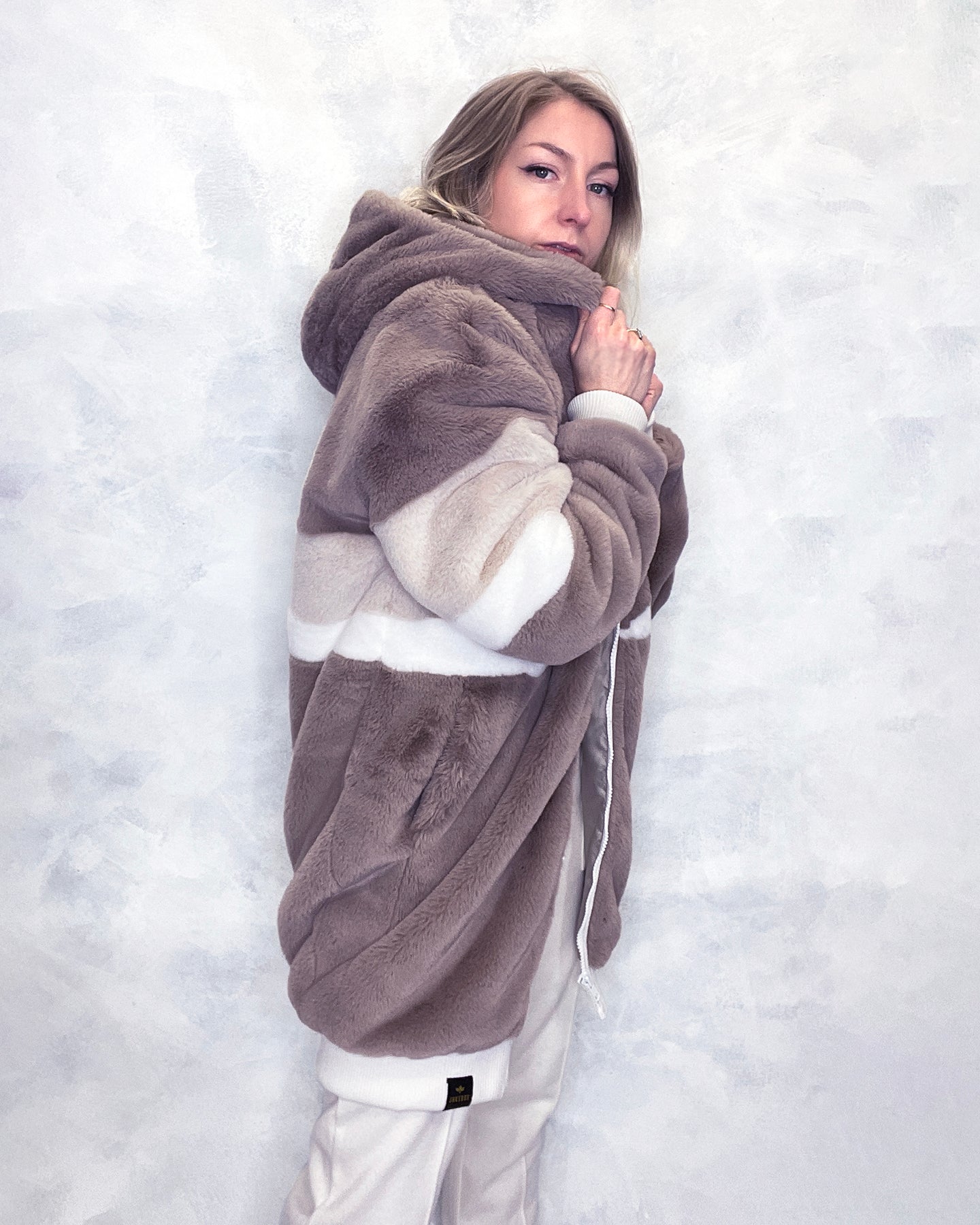 Taupe & Cream Faux Fur Hooded Long Bomber Jacket